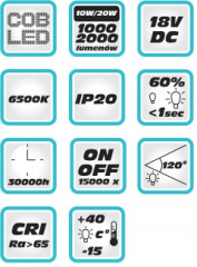 Toto zariadenie je vyrobené technológiou COB LED. Vďaka použitiu tejto technológie sa lampa vyznačuje plynulým svetelným tokom (bez pulzačného efektu), rozptýleným svetlom a širokým uhlom svietenia. Teplota farby je 6500K. Svietidlo môže pracovať v dvoch režimoch: 10W/1000 lúmenov a 20W/2000 lúmenov. Svietidlo je ideálne nielen na osvetlenie pracovného miesta, ale aj ako zdroj svetla na pikniku alebo kempingu. Zariadenie je možné umiestniť na stojan alebo zavesiť na stenu. Pevné puzdro vyrobené z hliníka.