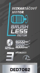 Prístroj je vybavený bezkomutátorovým motorom, ktorého výhodou je oveľa vyššia účinnosť a životnosť ako u klasického kefového motora. Brúska disponuje tromi rýchlosťami 6000/8500/11000min, vďaka ktorým si môžete optimálne zvoliť rýchlosť pre typ vykonávanej práce. Brúsny papier s priemerom 125 mm je upevnený na kotúči so suchým zipsom. Papiere a disk sú vybavené otvormi na zlepšenie odsávania prachu.