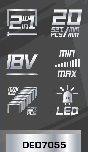 Technické údaje akumulátorovej sponkovačky 2v1 18V DEDRA SAS+ALL DED7055: