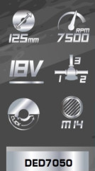 Technické údaje akumulátorovej uhlovej brúsky DEDRA SAS+ALL DED7050: