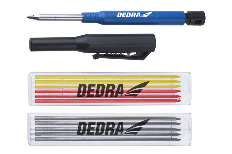 Ceruzka s vymeniteľným stylusom s klipom, 12 ks stylusov: Dĺžka/priemer stylusu: 6x čierny, 3x žltý, 3x červený: 125/2,8 mm, tvrdosť: HB, materiál: ABS; kov, zabudované orezávátko. Vhodné na písanie na rôzne povrchy: drevo, materiály podobné drevu, papier, kov, kameň, glazované dlaždice, lakoplastové sklo, plast, iné stavebné materiály.