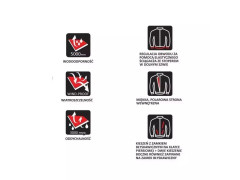 Materiál: 96% polyester/4% elastan; hmotnosť 320 g/m²; vodoodolnosť: 5000 mm; priedušnosť: 3000 mm; vetruodolnosť; sťahovacia šnúrka so zátkami v spodnom šve; 3 priestranné vrecká na zips