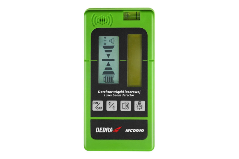 Detektor laserového lúča má zabudovaný reproduktor s dvoma akustickými tónmi, ktoré fungujú ako " bzučiak", t. j. zvukový signál pri detekcii lúča. Detektor je kompatibilný s laserovými lúčmi zelenej farby, napr. DEDRA MC0903, MC0904, MC0905, MC0906, ako aj červenej farby, napr. DEDRA MC0901. Prístroj sa ľahko ovláda vďaka ľahko čitateľnému displeju s podsvietením, držiaku na montáž na latku a 1/4" závitu na montáž na statív.