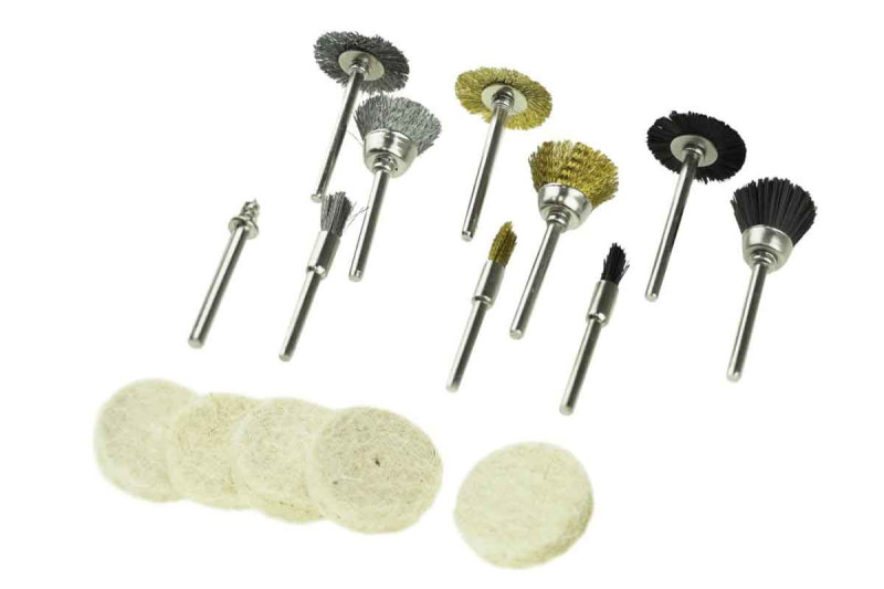 Sada obsahuje: 3ks mosadzných drôtených kefiek s priemerom 5, 15, 25mm; 3ks oceľových drôtených kefiek s priemerom 5, 15, 25mm; 3ks nylonových kefiek s priemerom 5, 15, 25mm; 5ks plstených kotúčov s priemerom 24mm, tŕň na upevnenie plstených kotúčov - priemer drieku 3,2mm