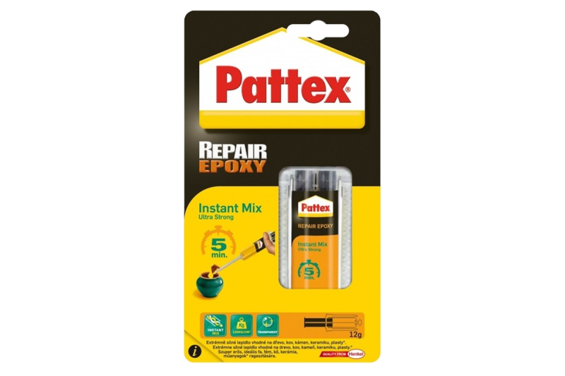 Pattex Repair Ultra Quick 5 min 11 ml je rýchlo vytvrdzujúce dvojzložkové epoxidové lepidlo určené na permanentné opravy, fixovanie a lepenie. Vďaka statickému zmiešavaču je zmiešanie oboch zložiek precízne a aplikácia je rýchla a jednoduchá. Jednotlivé zložky lepidla sa premiešajú priamo v zmiešavači. Vďaka statickému zmiešavaču je zmiešanie oboch zložiek precízne a aplikácie veľmi jednoduchá a rýchla.