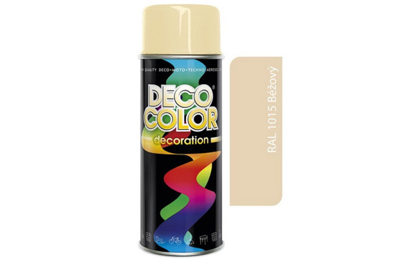 Deco color Farba v spreji decoration béžová 1015 400ml s novou receptúrou. Táto univerzálna farba je vhodná na hobby aj profi aplikácie, k použitiu na kov, drevo, keramiku, kameň, betón, sklo a niektoré plasty. Na povrchy PUR, PS, PA, EPDM, ABS, GfK, Hart-PVC – použite Plastic Primer – základ na plasty. Odoláva poškrabaniu, poveternostným vplyvom, benzínu a nafte.