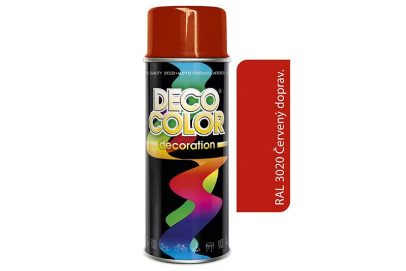 Deco color Farba v spreji decoration červený 3020 400ml s novou receptúrou. Táto univerzálna farba je vhodná na hobby aj profi aplikácie, k použitiu na kov, drevo, keramiku, kameň, betón, sklo a niektoré plasty. Na povrchy PUR, PS, PA, EPDM, ABS, GfK, Hart-PVC – použite Plastic Primer – základ na plasty. Odoláva poškrabaniu, poveternostným vplyvom, benzínu a nafte.
