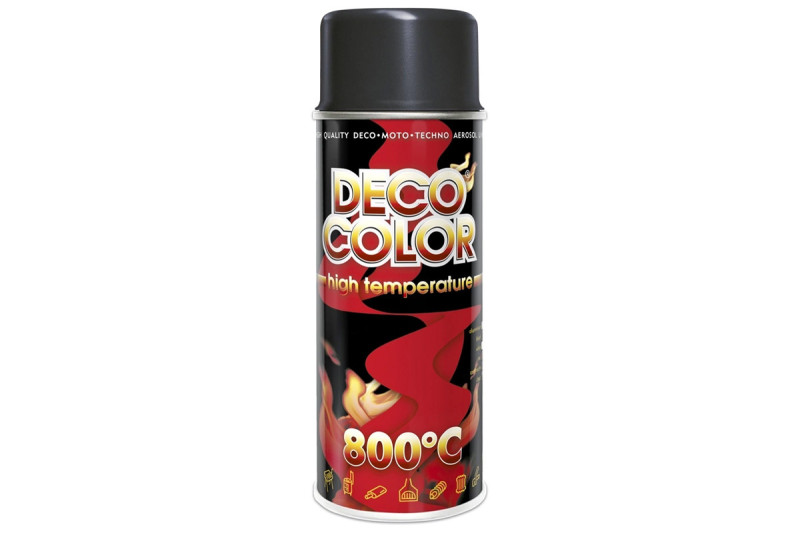 Deco color Farba v spreji na vysoké teploty antracit 400ml s výnimočnou odolnosťou voči vysokým teplotám, ktoré si zachovávajú svoju farbu aj pri teplotách 650°C. Majú široké využitie: v automobilovom priemysle, výfukové tlmiče, motory, v priemysle na malovanie komínov, pecí v domácnosti na krby, kachle, ohrievače, kotle.
