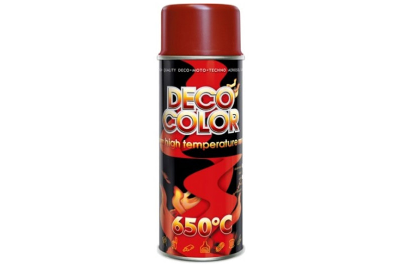 Deco color Farba v spreji na vysoké teploty červená 400ml s výnimočnou odolnosťou voči vysokým teplotám, ktoré si zachovávajú svoju farbu aj pri teplotách 650°C. Majú široké využitie: v automobilovom priemysle, výfukové tlmiče, motory, v priemysle na malovanie komínov, pecí v domácnosti na krby, kachle, ohrievače, kotle.