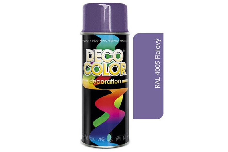Deco color Farba v spreji decoration fialová 4005 400ml s novou receptúrou. Táto univerzálna farba je vhodná na hobby aj profi aplikácie, k použitiu na kov, drevo, keramiku, kameň, betón, sklo a niektoré plasty. Na povrchy PUR, PS, PA, EPDM, ABS, GfK, Hart-PVC – použite Plastic Primer – základ na plasty. Odoláva poškrabaniu, poveternostným vplyvom, benzínu a nafte.