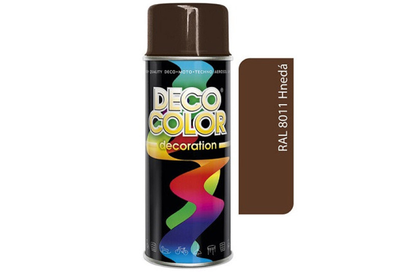 Deco color Farba v spreji decoration hnedá 8011 400ml s novou receptúrou. Táto univerzálna farba je vhodná na hobby aj profi aplikácie, k použitiu na kov, drevo, keramiku, kameň, betón, sklo a niektoré plasty. Na povrchy PUR, PS, PA, EPDM, ABS, GfK, Hart-PVC – použite Plastic Primer – základ na plasty. Odoláva poškrabaniu, poveternostným vplyvom, benzínu a nafte.