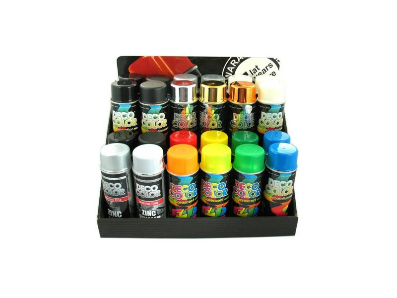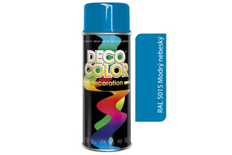 Deco color Farba v spreji decoration modrý nebeský 5015 400ml s novou receptúrou. Táto univerzálna farba je vhodná na hobby aj profi aplikácie, k použitiu na kov, drevo, keramiku, kameň, betón, sklo a niektoré plasty. Na povrchy PUR, PS, PA, EPDM, ABS, GfK, Hart-PVC – použite Plastic Primer – základ na plasty. Odoláva poškrabaniu, poveternostným vplyvom, benzínu a nafte.