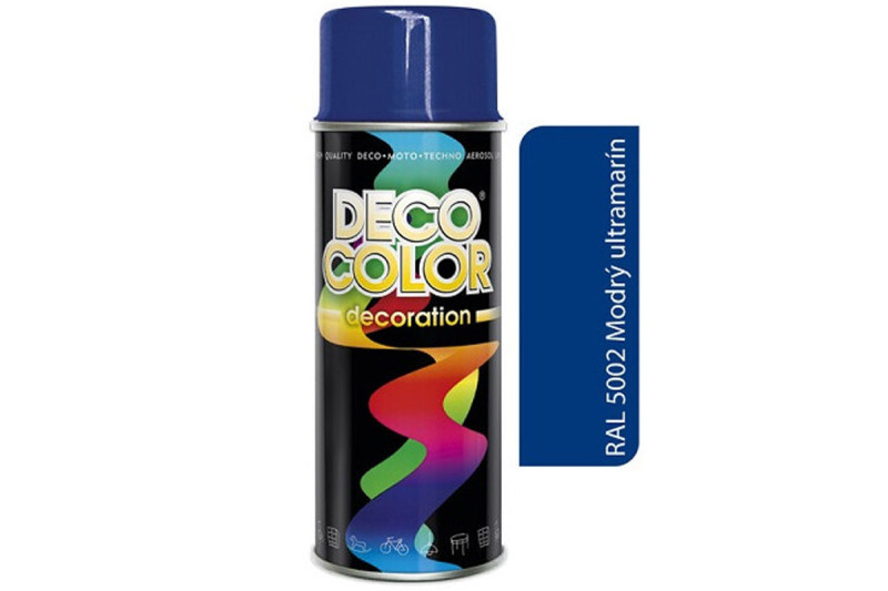 Deco color Farba v spreji decoration modrá 5002 400ml s novou receptúrou. Táto univerzálna farba je vhodná na hobby aj profi aplikácie, k použitiu na kov, drevo, keramiku, kameň, betón, sklo a niektoré plasty. Na povrchy PUR, PS, PA, EPDM, ABS, GfK, Hart-PVC – použite Plastic Primer – základ na plasty. Odoláva poškrabaniu, poveternostným vplyvom, benzínu a nafte.