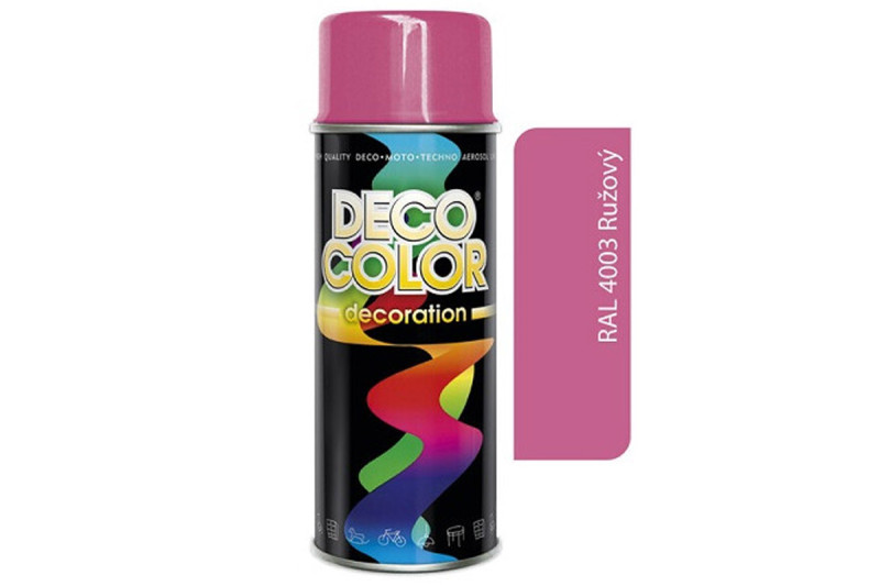 Deco color Farba v spreji decoration ružová 4003 400ml s novou receptúrou. Táto univerzálna farba je vhodná na hobby aj profi aplikácie, k použitiu na kov, drevo, keramiku, kameň, betón, sklo a niektoré plasty. Na povrchy PUR, PS, PA, EPDM, ABS, GfK, Hart-PVC – použite Plastic Primer – základ na plasty. Odoláva poškrabaniu, poveternostným vplyvom, benzínu a nafte.