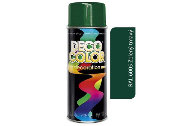 Deco color Farba v spreji decoration zelená tmavá 6005 400ml s novou receptúrou. Táto univerzálna farba je vhodná na hobby aj profi aplikácie, k použitiu na kov, drevo, keramiku, kameň, betón, sklo a niektoré plasty. Na povrchy PUR, PS, PA, EPDM, ABS, GfK, Hart-PVC – použite Plastic Primer – základ na plasty. Odoláva poškrabaniu, poveternostným vplyvom, benzínu a nafte.