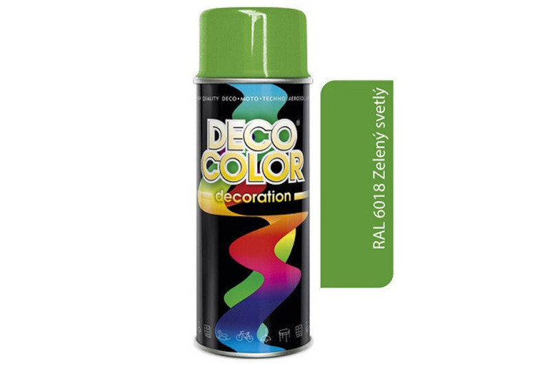 Deco color Farba v spreji decoration zelená svetlá 6018 400ml s novou receptúrou. Táto univerzálna farba je vhodná na hobby aj profi aplikácie, k použitiu na kov, drevo, keramiku, kameň, betón, sklo a niektoré plasty. Na povrchy PUR, PS, PA, EPDM, ABS, GfK, Hart-PVC – použite Plastic Primer – základ na plasty. Odoláva poškrabaniu, poveternostným vplyvom, benzínu a nafte.