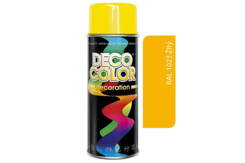 Deco color Farba v spreji decoration žltá 1023 400ml s novou receptúrou. Táto univerzálna farba je vhodná na hobby aj profi aplikácie, k použitiu na kov, drevo, keramiku, kameň, betón, sklo a niektoré plasty. Na povrchy PUR, PS, PA, EPDM, ABS, GfK, Hart-PVC – použite Plastic Primer – základ na plasty. Odoláva poškrabaniu, poveternostným vplyvom, benzínu a nafte.