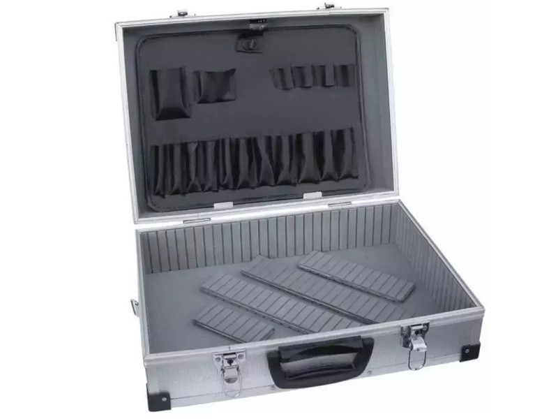 Materiál: hliník; rozmery: 460x325x150 mm; odolný proti poškodeniu; množstvo vreciek a priehradiek; kovové uzávery; prepravný popruh