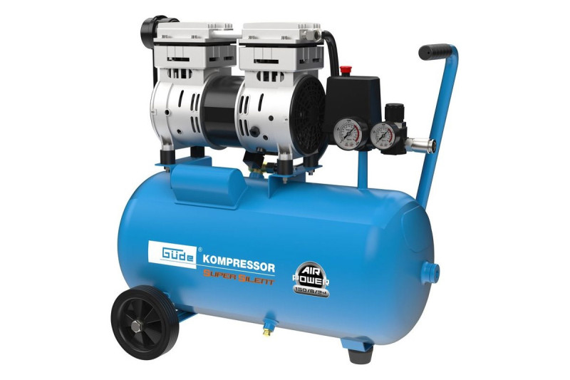 Bezolejový dvojvalcový piestový kompresor, dvojpiestový agregát s priamym pohonom. Mechanický tlakový spínač, manometer na meranie tlaku v nádobe a pracovného tlaku, 24-litrová nádrž s gumovými tlmičmi, rukoväť na prenášanie. Tichý chod. Jedna pneumatická spojka, bezpečnostný ventil a vypúšťacia skrutka na kondenzát.