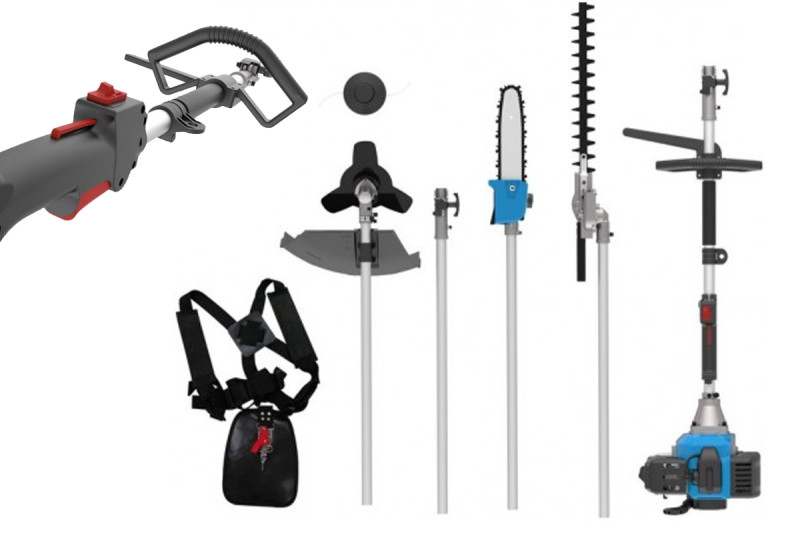 Sada pre všetky práce v záhrade, na dvore a na pozemku. Vzduchom chladený dvojtaktný motor, palivová pumpa, mäkká rukoväť, prídavná rukoväť. Predĺženie vhodné pre všetky nadstavce. Pohodlný systém popruhov. Súčasťou sady sú motorová jednotka, prerezávacia píla, krovinorez a vyžínač, nožnice na živý plot, nadstavec, nádoba na miešanie paliva a popruh na prenášanie.