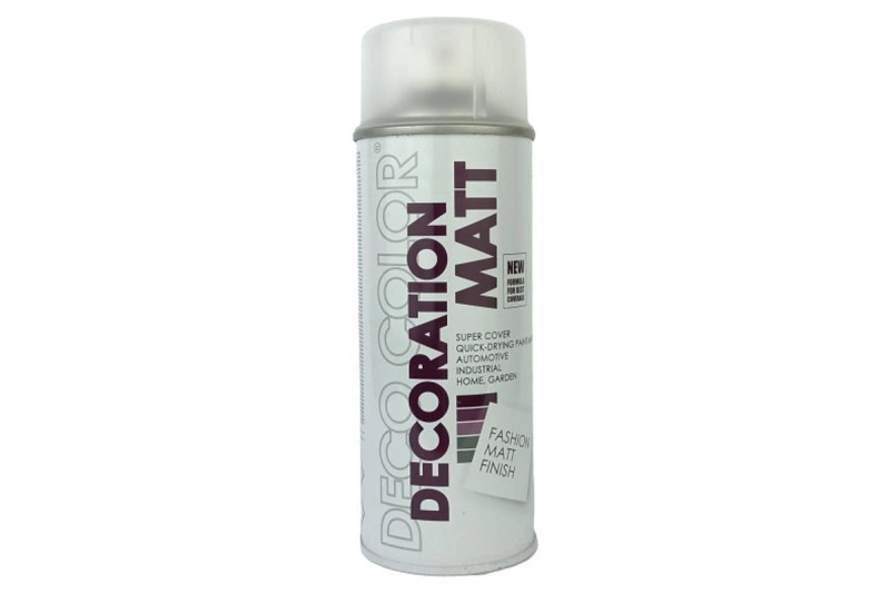 Deco color Farba v spreji bezfarebná matná 0000 400ml je univerzálna farba vhodná na hobby aj profi aplikácie, k použitiu na kov, drevo, keramiku, kameň, betón, sklo a niektoré plasty. Upozornenie: na povrchy PUR, PS, PA, EPDM, ABS, GfK, Hart-PVC – použite Plastic Primer – základ na plasty. Odoláva poškrabaniu, poveternostným vplyvom, benzínu a nafte. Rada výrobkov vychádza z najnovšej technológie, prispôsobené požiadavkám smernice 42/2004/EU. Laky sú šetrné k životnému prostrediu. Neobsahujú toluén. Veľmi dobré krytie povrchu Vysoký lesk