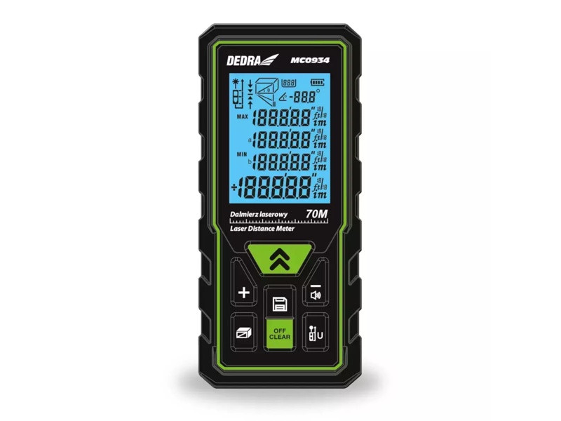 Dosah lasera: 50 m; rozsah merania: 0,05 m-50 m; vlnová dĺžka: 635 nm; presnosť: ±2 mm/10 m; výkon: <1 mW; 7 funkcií; 6-riadkový displej; presná optika; trieda lasera II