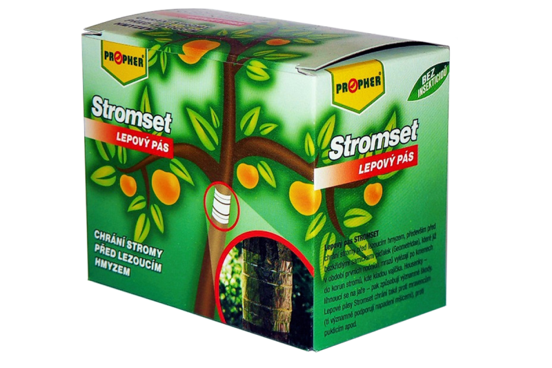 STROMSET lepový pás slúži ako ochrana stromov pred lezúcim hmyzom, najmä bezkrídle samičky piadiviek, puklice a mravce. Dĺžka pásu 300 cm umožní ošetriť priemerne 6 stromov. Súprava obsahuje aj samolepiace prúžky na ľahké upevnenie pásu na kmeň.