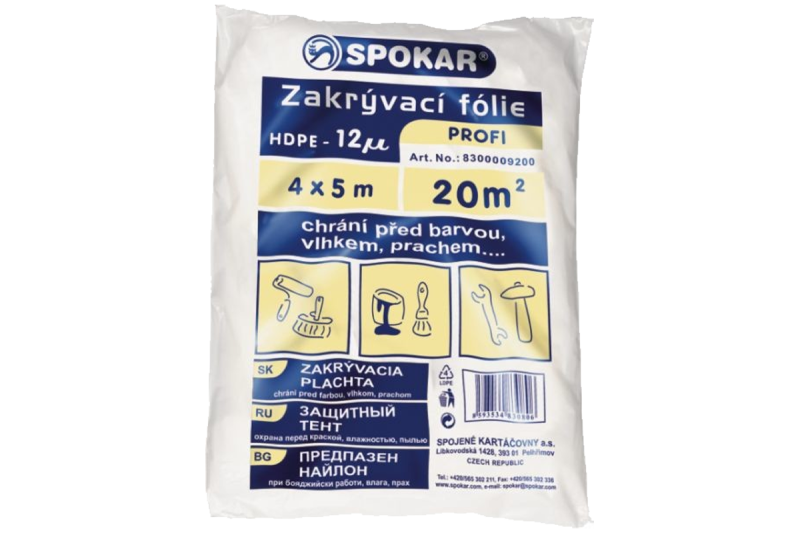 Zakrývacia fólia s rozmermi 4 x 5 m chráni pred farbou, prachom či vlhkom. Hrúbka fólie je 12 my (mikrónov).