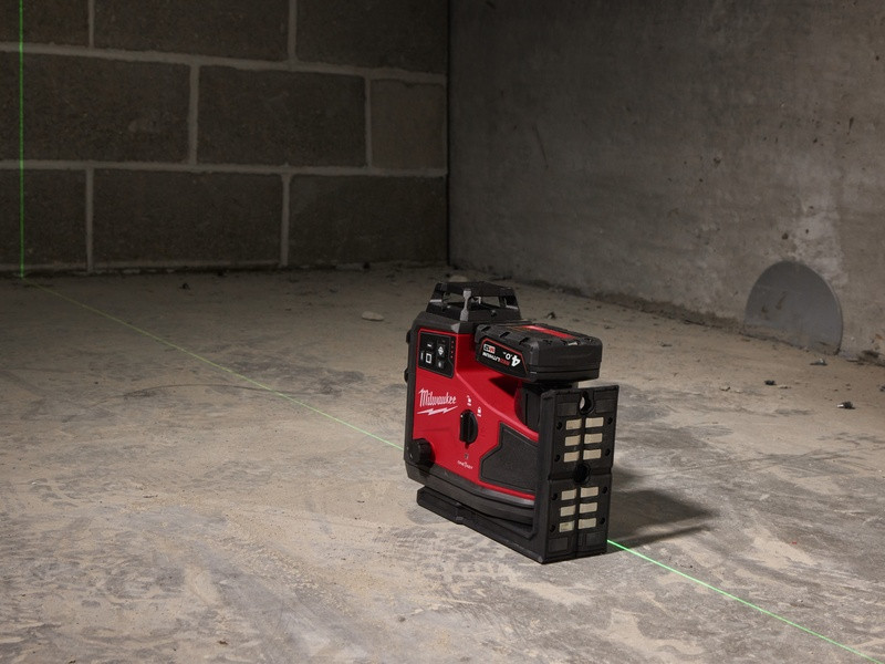- M12™ zelený 360° laser s 3 rovinami poskytuje funkciu „všetko v jednom“ s jednou horizontálnou čiarou a dvoma vertikálnymi čiarami na rýchle a jednoduché zarovnanie, vyrovnanie, vyrovnanie do štvorca a prenosy, čo vám umožní ľahko rozvrhnúť veľké priestory pomocou jedného nástroja.