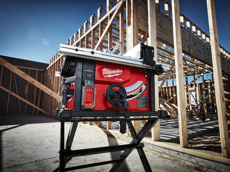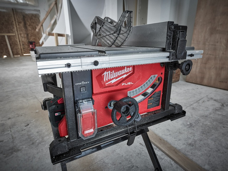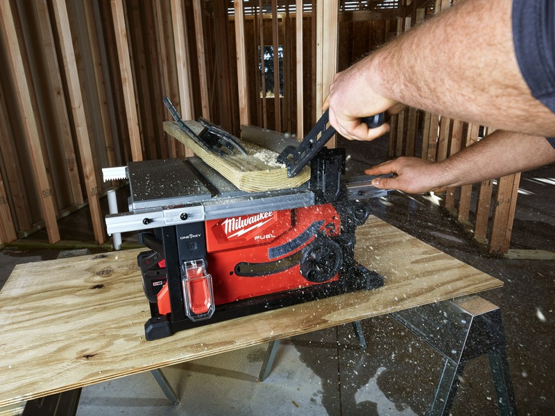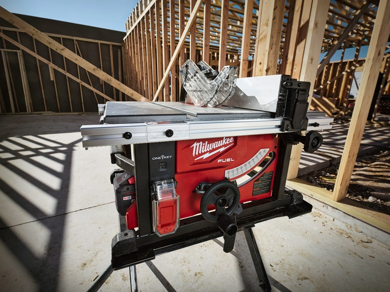 - Stolová píla ONE-KEY™ M18 FUEL™ umožňuje pozdĺžne rezy s rýchlosťou posuvu, akou disponuje rovnaká stolová píla s napájacím káblom, a vykoná rez s dĺžkou 190 m na OSB doskách s hrúbkou 19 mm na jedno nabitie akumulátora s kapacitou 12,0 Ah