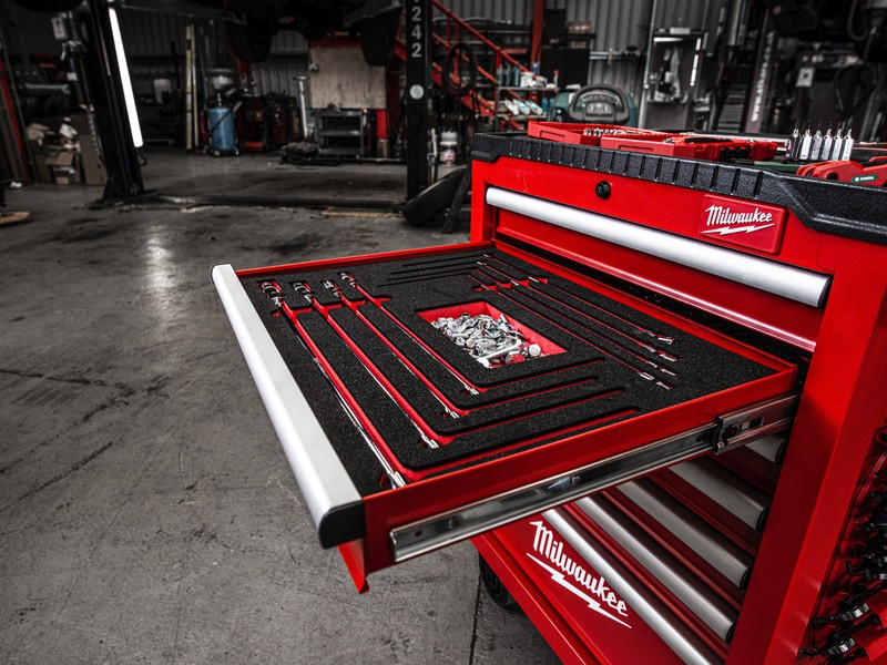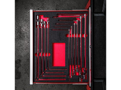 - Prvotriedna pena pre dlhšiu životnosť, laserom vyrezané veľkosti pre jednoduchú a rýchlu identifikáciu veľkosti a červené pozadie pre rýchlu identifikáciu chýbajúcich nástrojov.