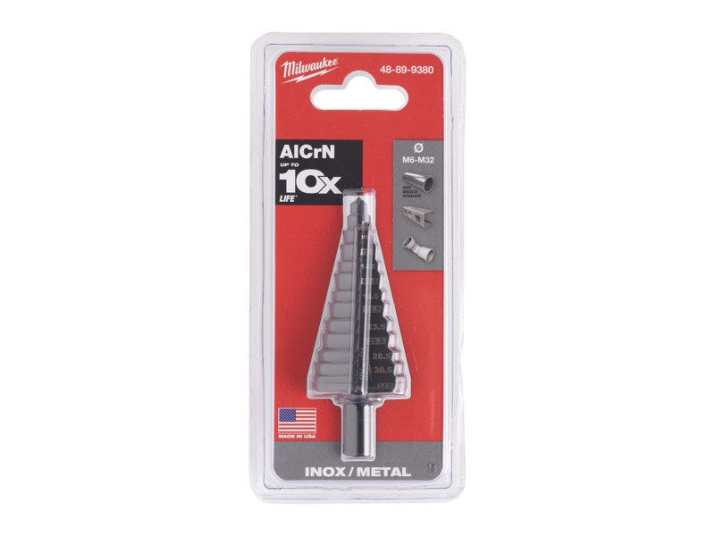 - Nová povrchová úprava z nitridu hliníka a chrómu (AlCrN) pre 10x dlhšiu životnosť v porovnaní so štandardným stupňovým vrtákom MILWAUKEE®.