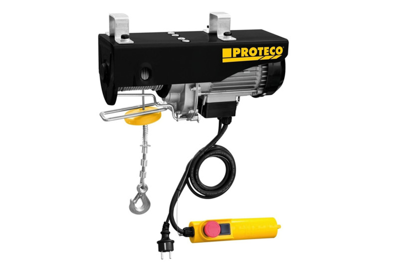 Elektrický lanový naviják Proteco 500/250 kg je vhodný k zvislému zdvíhaniu a spúšťaniu bremien s kladkou alebo bez. Ak použijete kladku, možno zdvíhat náklady s maximálnou hmotnosťou 500 kg do výšky 6 m. Režim bez kladky je určený pre predmety do 250 kg, ktoré zdvihnete do výšky 12 m. Pohon navijáku zabezpečuje asynchrónny motor s príkonom 1 000 W, ktorý je vybavený tepelnou ochrannou. Tá zabezpečí v prípade prehriatia motora jeho odpojenie. Po vychladnutí motora je jeho funkcia opäť obnovená. Motor je vybavený elektromechanickú brzdou, ktorá pri vypnutí el. prúdu ihneď zaistí manipulované bremeno v aktuálnej pozicií. Prevod je zložený z oceľových kalených kolies so stálou tukovou náplňou v hliníkovej skrini. Hriadele sú uložené v guľôčkových ložiských. Na ovládanie navijaku slúži ovládač, ktorý je vybavený kolískovým prepínačom - zdvíhanie a spúštanie bremena a bezpečnostným STOP tlačidlom. Pre zníženie zaťaženia prívodného kábla je ovládač zavesený na oceľovom lanku.