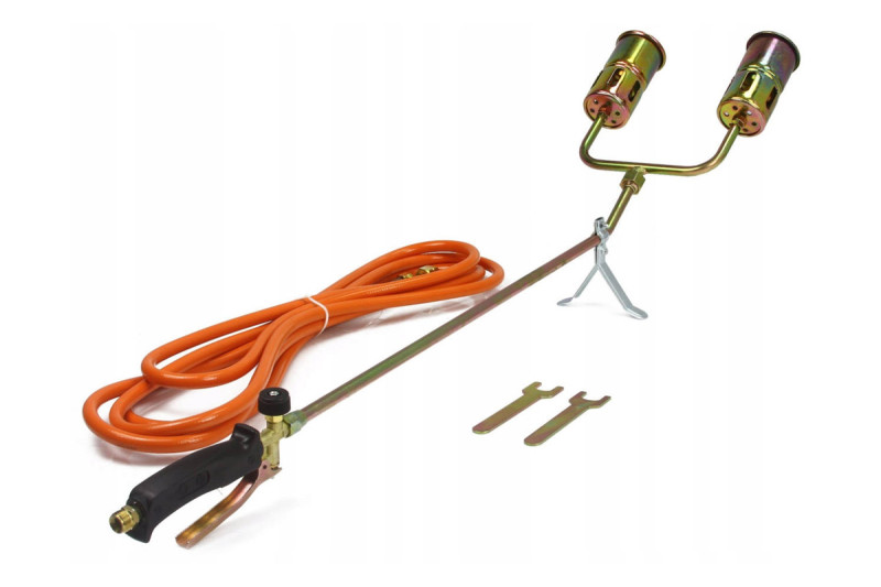 Horák plynový s 2 tryskami, dĺžka 85 cm, hadica 3 m, priemer horákov 60 mm, MAR-POL. Ľahko použiteľný univerzálny plynový horák na propán-bután s hadicou na fľašu.