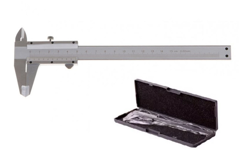Posuvné meradlo 0 - 150 mm s presnosťou 0,02 mm, metrická stupnica v mm, hĺbkomer, kvalitná nerezová oceľ, presné spracovanie, plynulý posuv, skrutková aretácia - vhodné na stabilnejší prenos rozmerov, tabuľka prevodov jednotiek, plastové puzdro.
