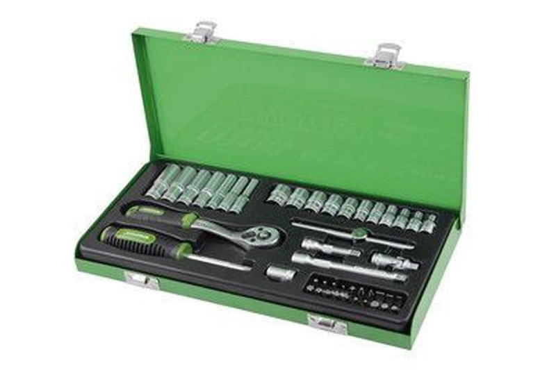 Gola sada 1/4 "45 dielov v kovovom boxe je veľmi obsiahla gola sada z rady PROTECO Drive. Vďaka svojej obrovskej popularite si našla cestu ako medzi robotnícke profesie, montérov, profesionálov, tak aj do dielní bežných domácich majstrov. Je vynikajúcou kombináciou kvalitných račien , hlavíc, bitov, apod. Všetko je z kvalitnej chróm-vanádiovej ocele a ponúka tak svojim užívateľom netušený komfort s možnosťou rôznych kombinácií pri používaní ručného náradia. Prevedenie hlavíc DRIVE zaisťuje bezpečný úchop hlavice skrutky alebo matice po celom jej obvode a eliminuje tak prípadné poškodenie . Rukoväte račne a držiaky bitov sú z kvalitného dvojplastového materiálu zaisťujúci kvalitný a bezpečný úchop vďaka svojmu ergonomickému tvaru.
