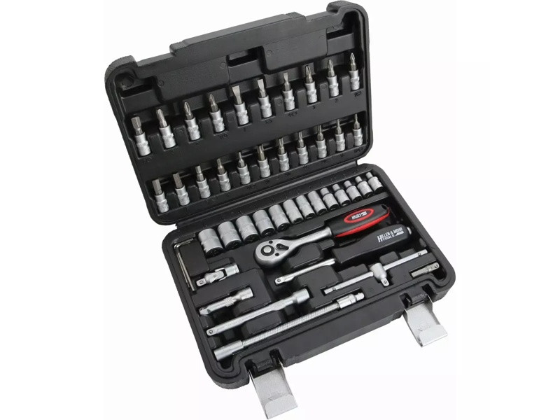 CrV oceľ; plastový kufrík; obsahuje: nástrčné kľúče, račne, adaptéry, držiaky nástrčiek a bitov, predĺženia; kombinované kľúče, bity. 46 položiek