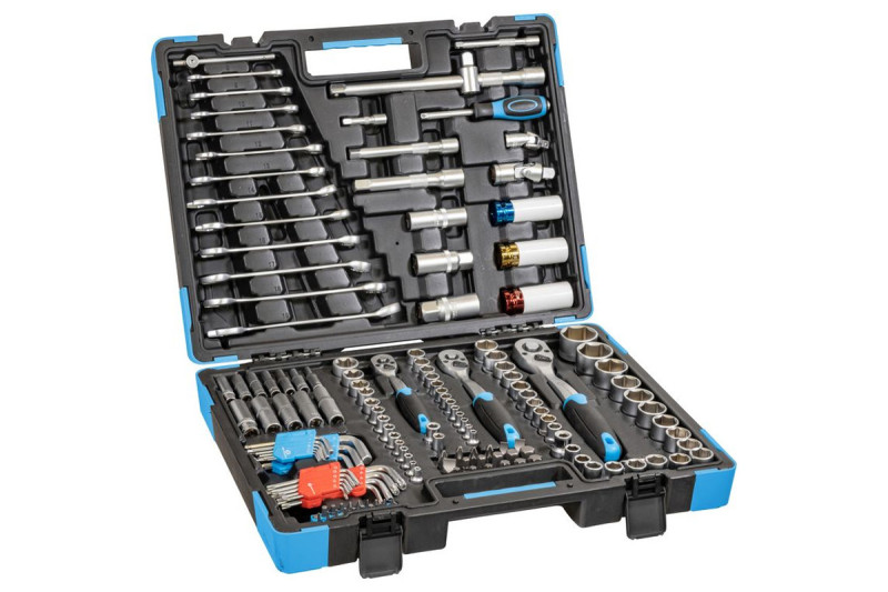 Sada náradia z chróm-vanádiovej ocele obsahuje 3 račne na prepínanie (1/2", 3/8", 1/4"), predĺženia, kardanové kĺby, očko-vidlicové kľúče, inbusové kľúče, nástrčkové kľúče, posuvné T-rukoväte, bitové adaptéry, skrutkovač s račňovou funkciou, súpravy bitov, nástrčkové kľúče na rázový uťahovák.
