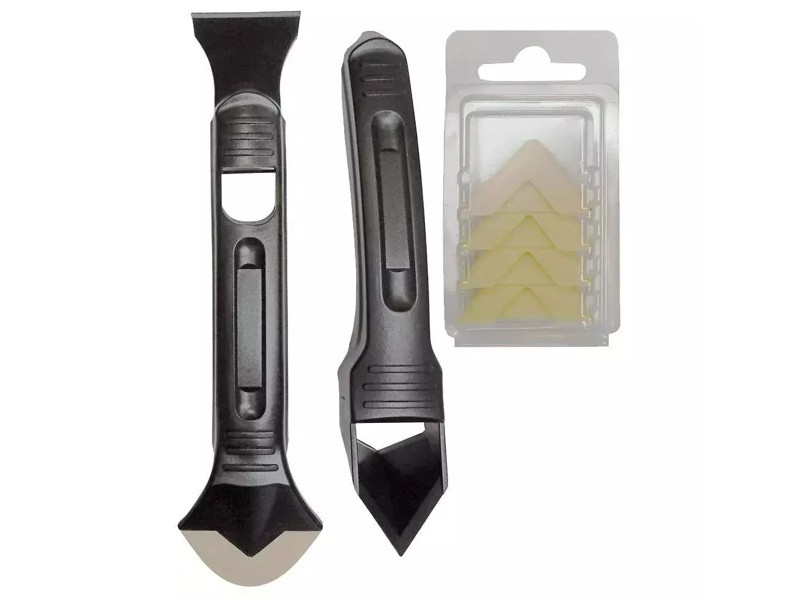 Náradie vyrobené z pevného polyméru (POM), ktorý je odolný voči pôsobeniu rozpúšťadiel a alkalických látok, nadstavce na škrabku (5 ks s rôznymi profilmi na lepšie prispôsobenie k škáre) vyrobené s flexibilného materiálu (TPV) odolného voči deformácii