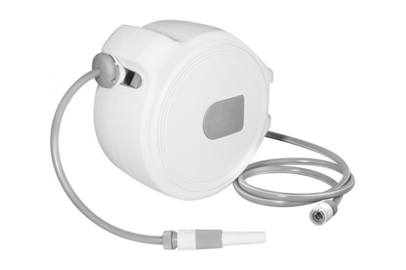 Automatický bubon s hadicou 30 m s výpletom, rukoväť, 2 rýchlospojky, pripojovací kus pre rýchlospojku pre 3/4″ IG / 1/2″ IG, tryska, držiak na stenu s kotviacim materiálom, automatika navíjania s vedením – vďaka tomu sa hadica navíja po vrstvách, bubon zastane po každej ½ otáčke, stop vťahovania.