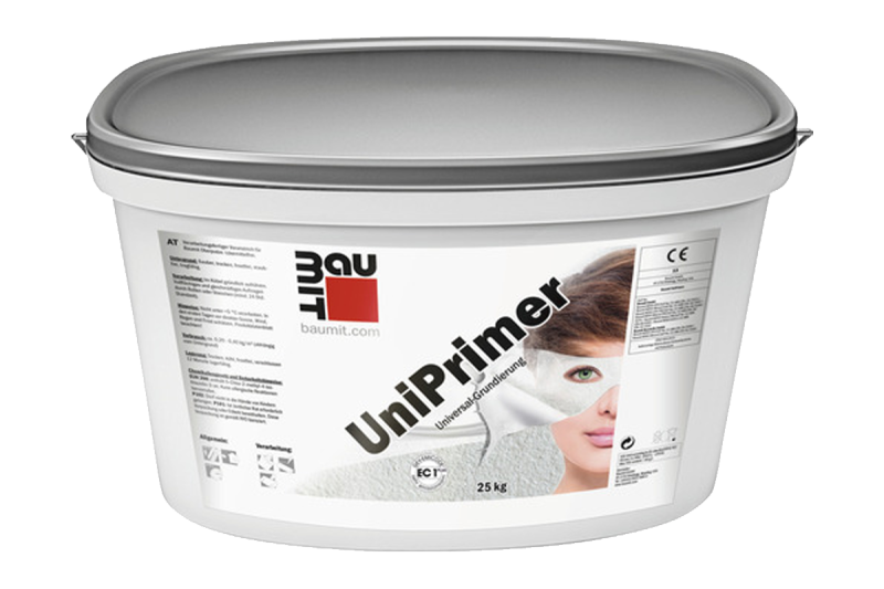 Penetračný náter Baumit UniPrimer nanášajte na podklad valčekom alebo štetcom a to rovnomerne bez prerušenia. V prípade potreby napr. pri veľmi teplom počasí je možné pridať max. 5 % vody (max. 1 l vody/ 25 kg vedro). V prípade, že sa na podklade vyskytujú mikrovlásočnicové trhliny, použite špeciálny penetračný náter obohatený vláknami Baumit FillPrimer.