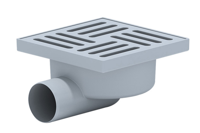 Vpusť podlahová 150×150/50 mm bočná, mriežka šedá, vodná zápachová uzávera