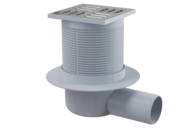 Vpusť podlahová 150×150/50 mm bočná, mriežka šedá, vodná zápachová uzávera