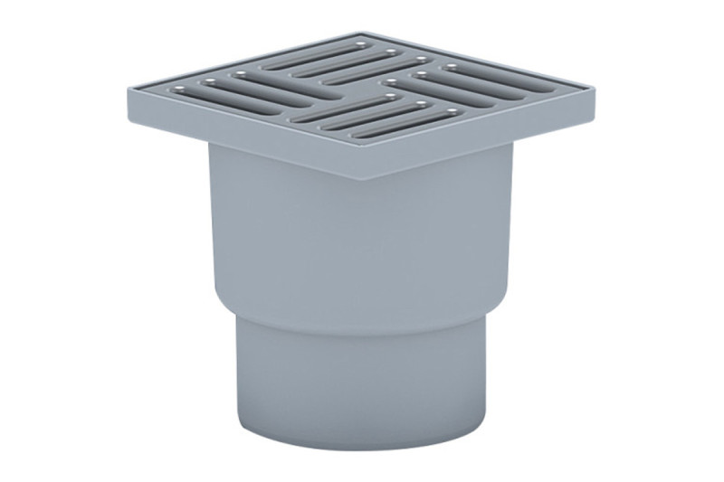 Vpusť podlahová 150×150/50 mm bočná, mriežka šedá, vodná zápachová uzávera